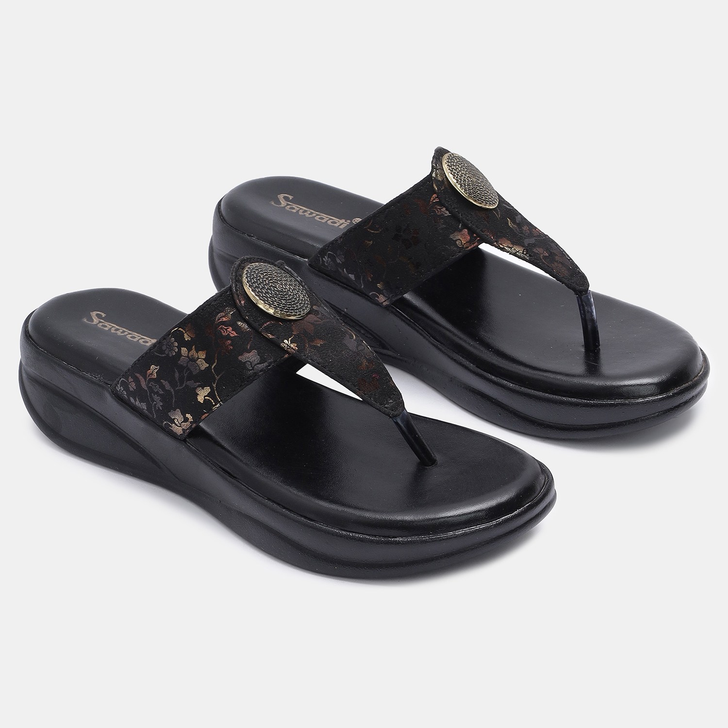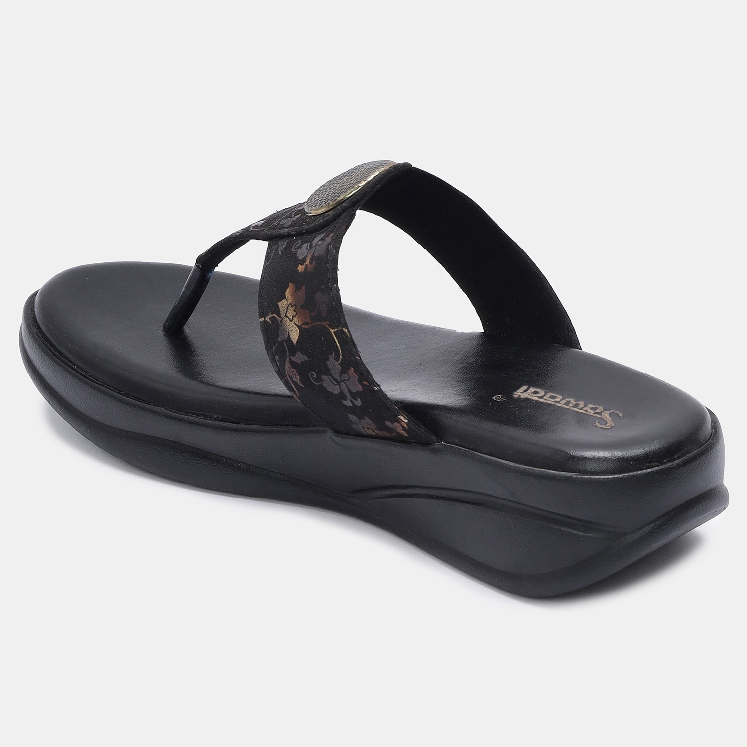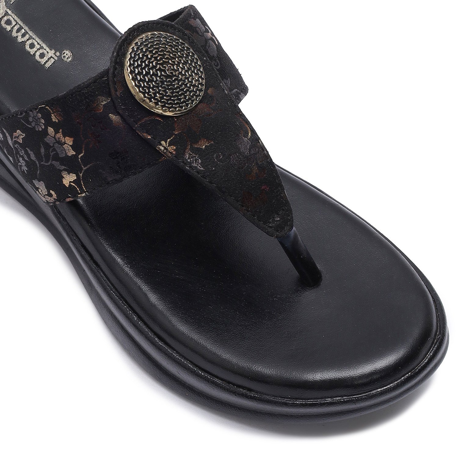 Home / Products / Women's Black Wedge Sandals with Toe Ring | Stylish Floral Slip-On Comfort Footwear ₹ 449 - 500