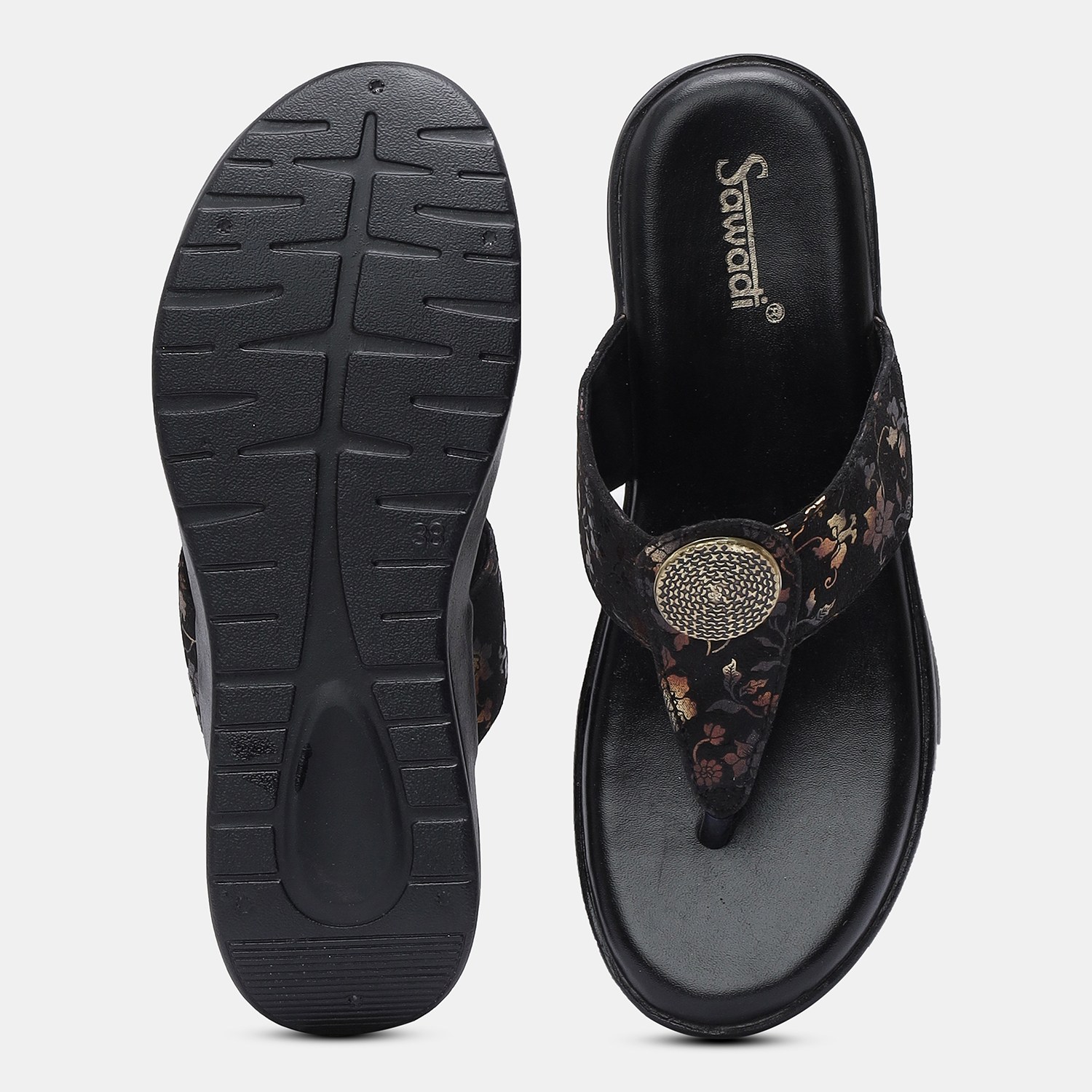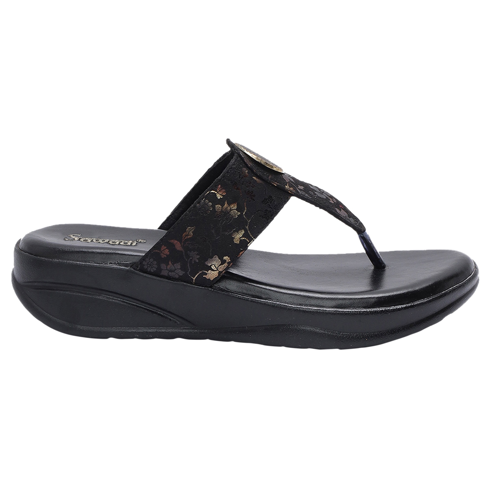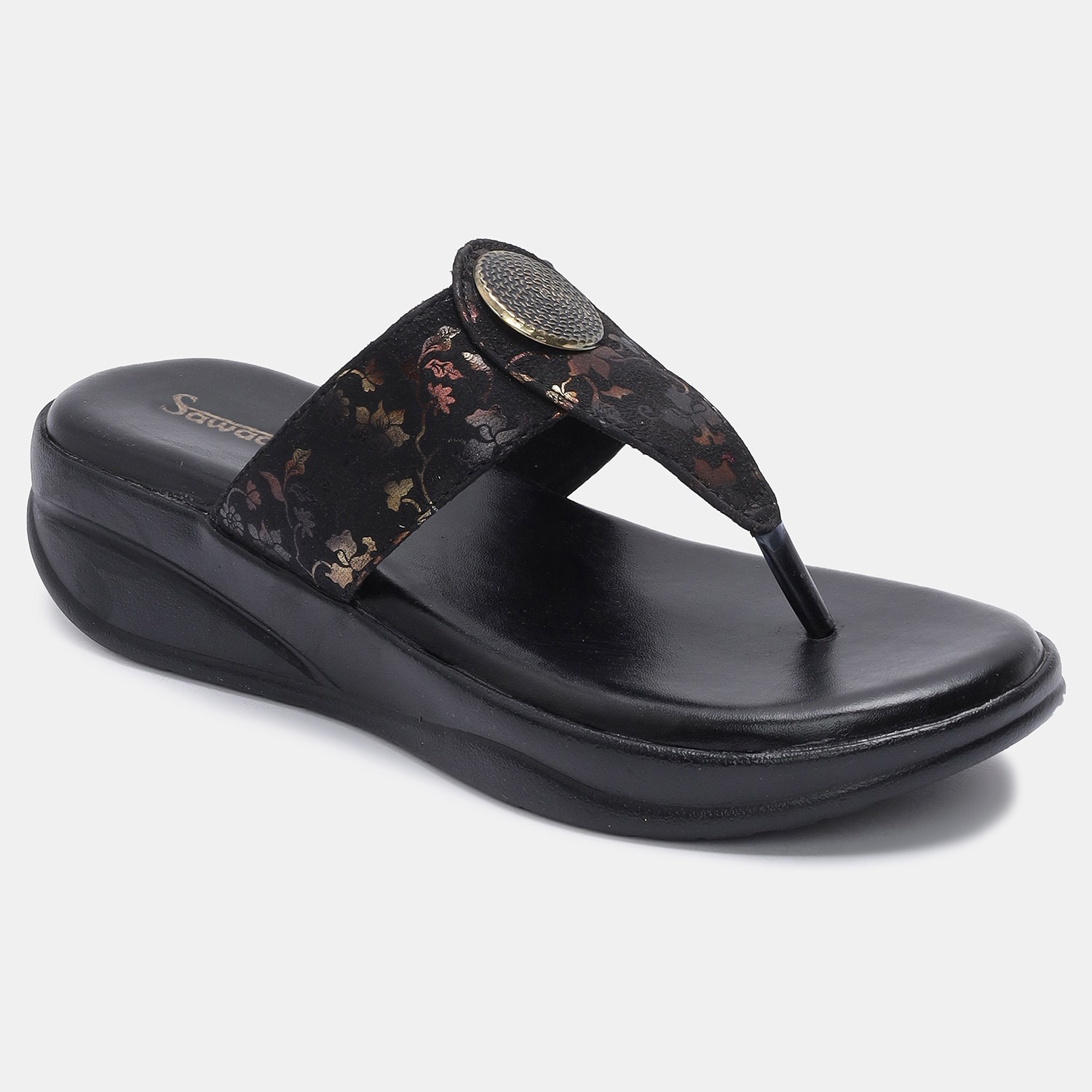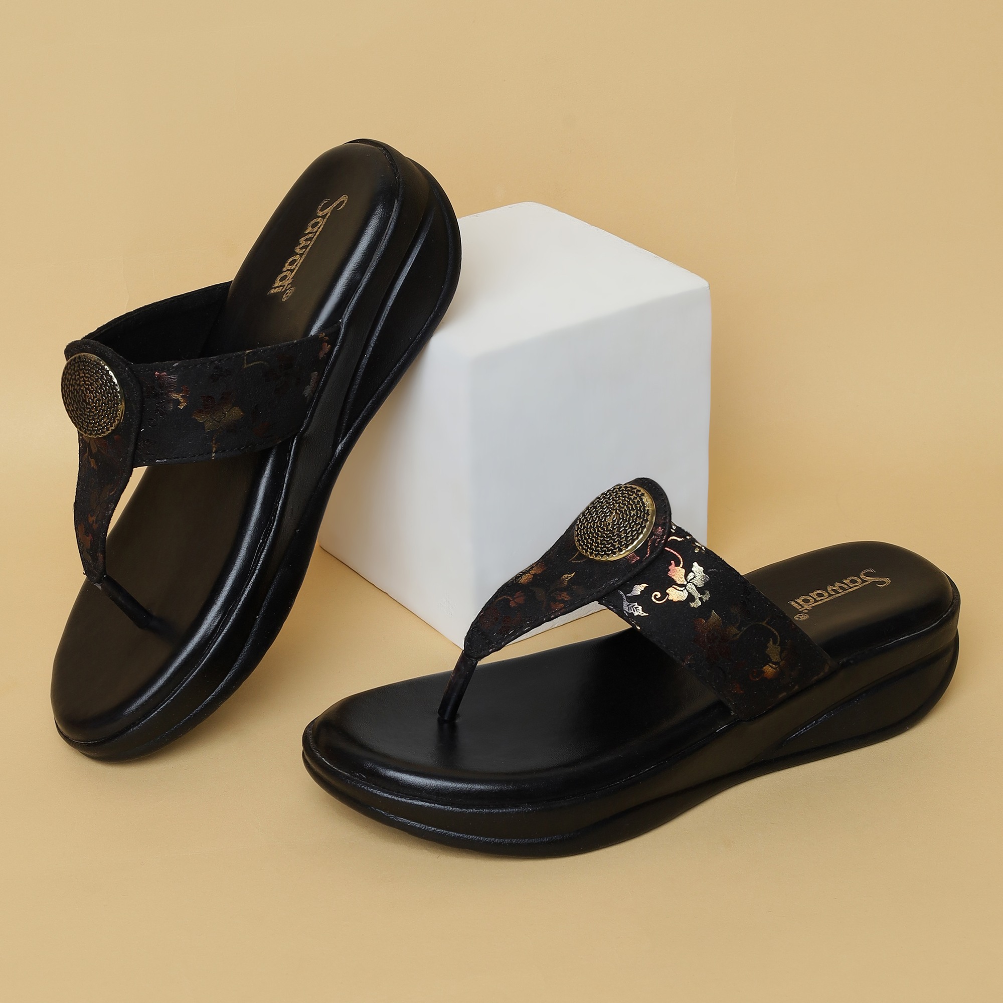 Home / Products / Women's Black Wedge Sandals with Toe Ring | Stylish Floral Slip-On Comfort Footwear ₹ 449 - 500