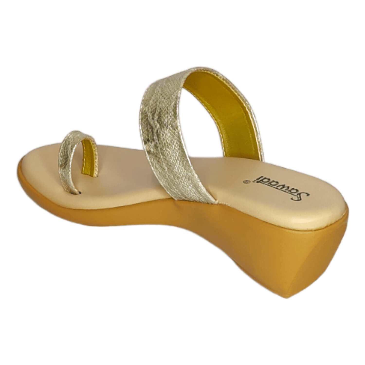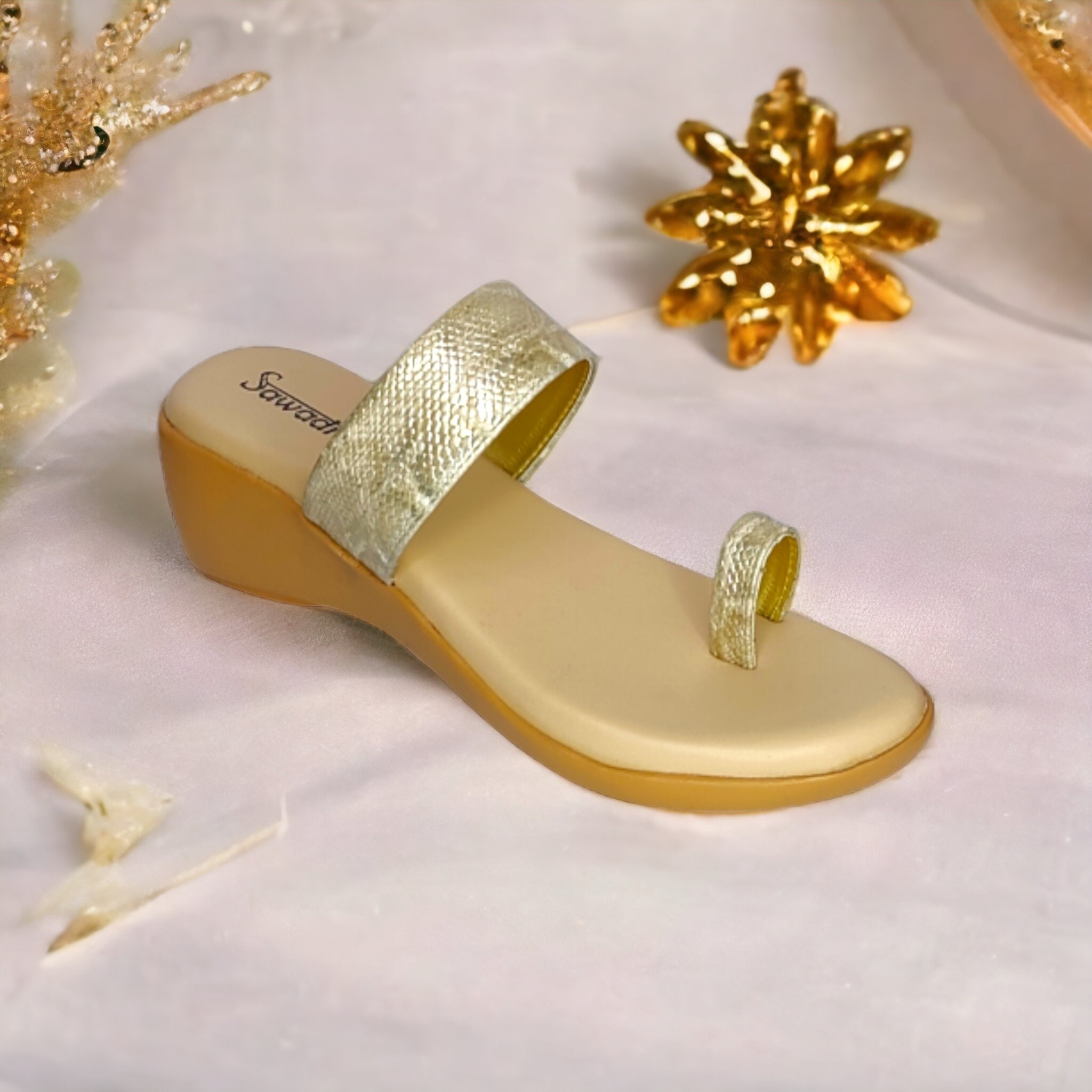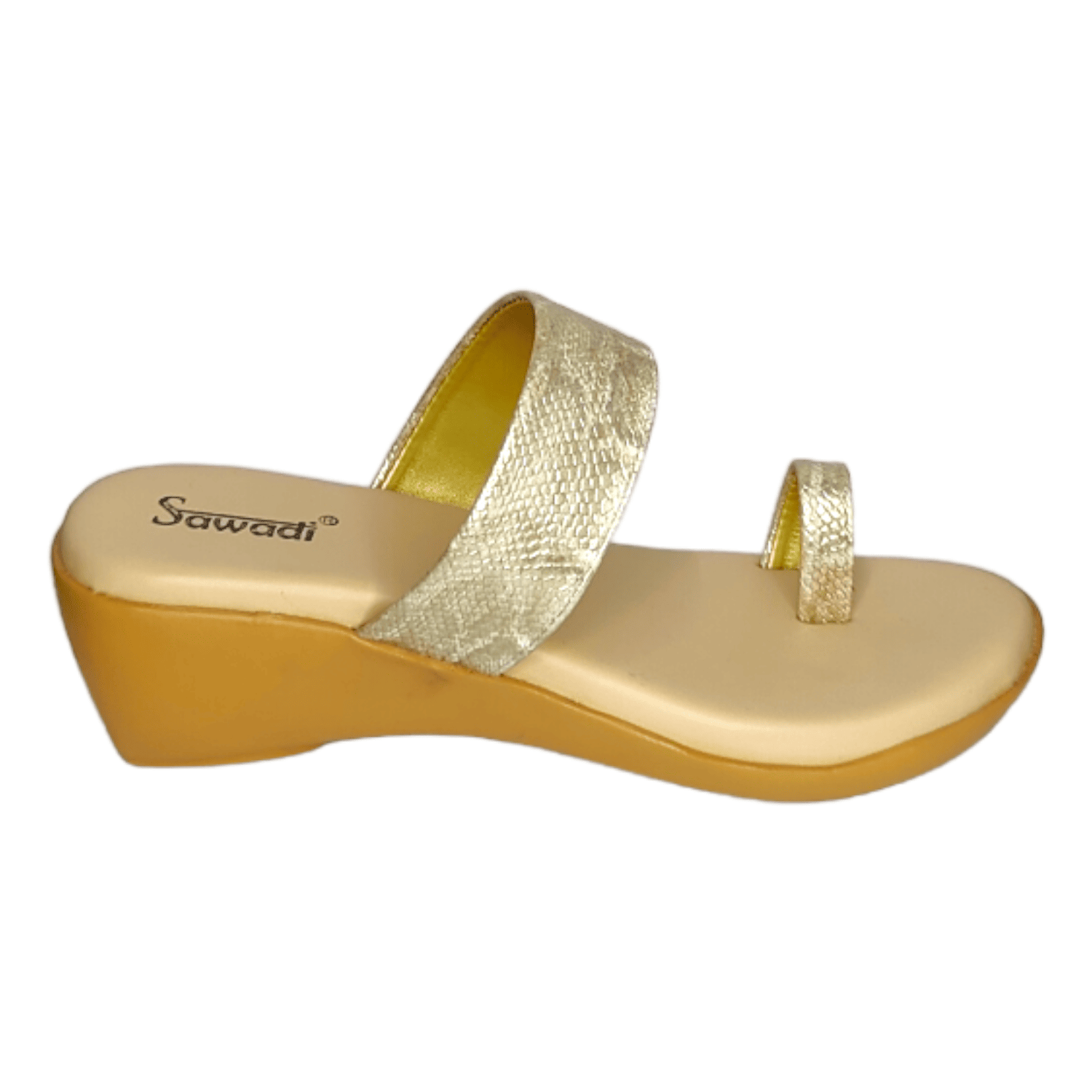 This stylish pair of Sawadi Sanke print Toe-Ring Heel Chappals is perfect for any occasion. Featuring a beige color and classic toe-ring design, these chappals will add an effortless touch of elegance to your look. Made with high quality materials, these sandals are sure to provide you with long lasting comfort and style.