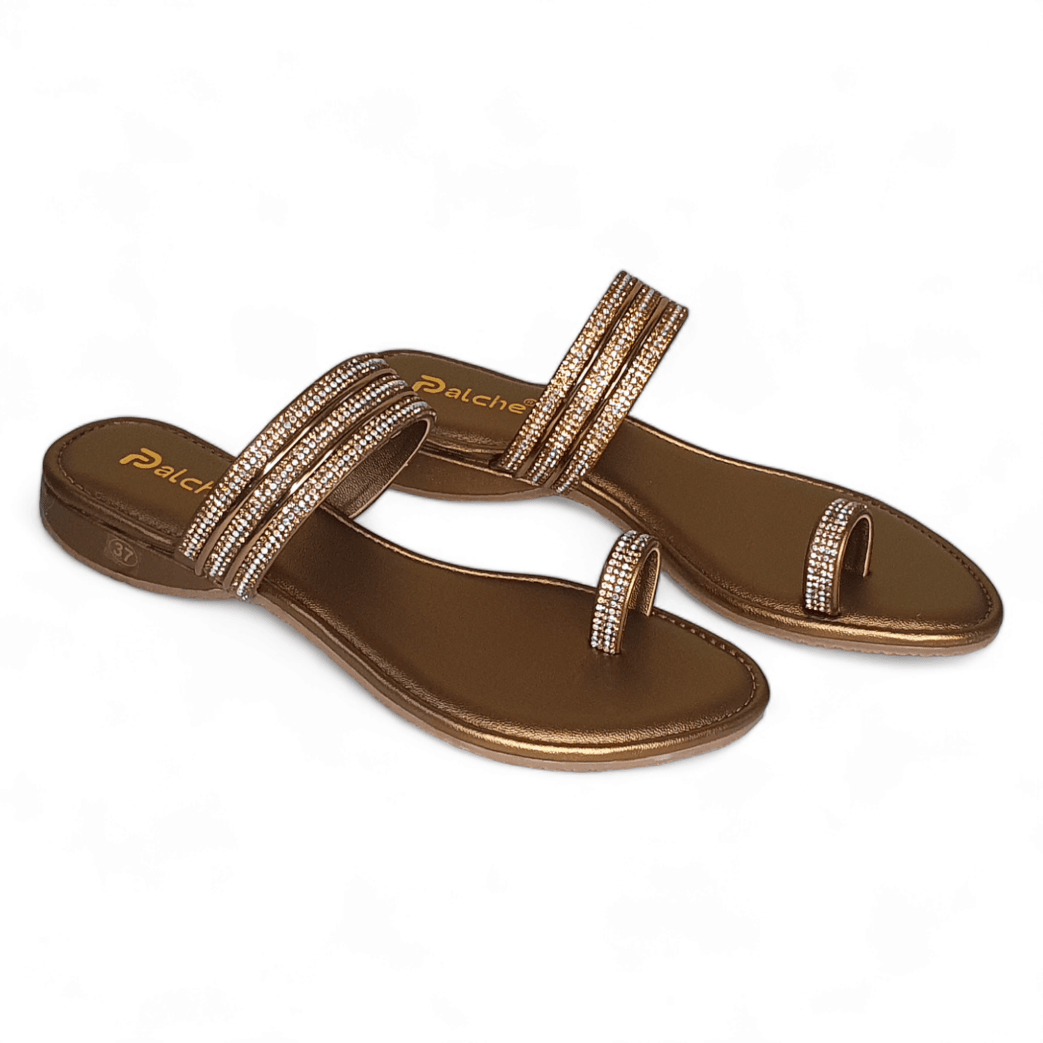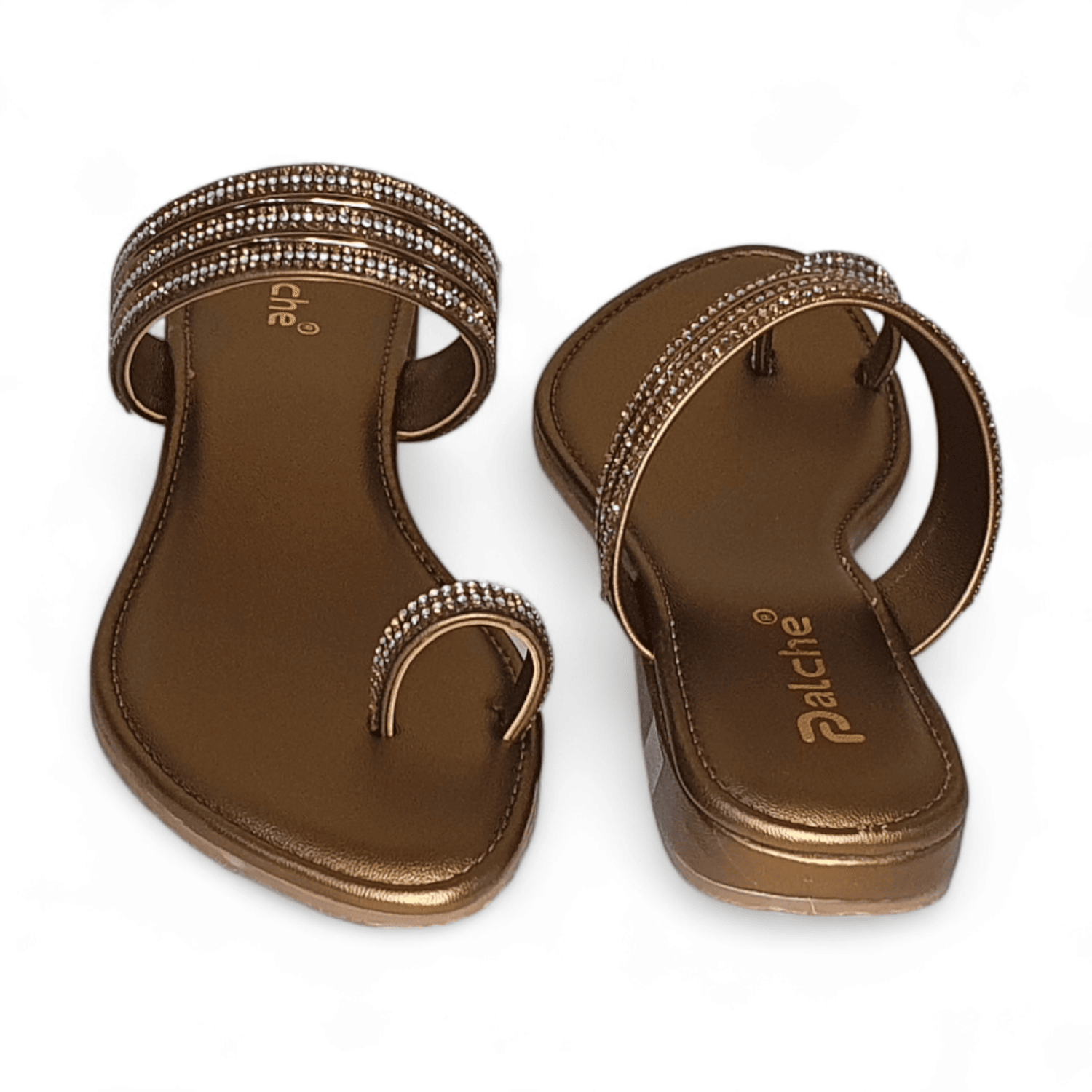 Home / Products / Women's Bronze Designer Toe Ring Flats with Rhinestone Straps – Elegant Festive Footwear Price inclusive of all tax