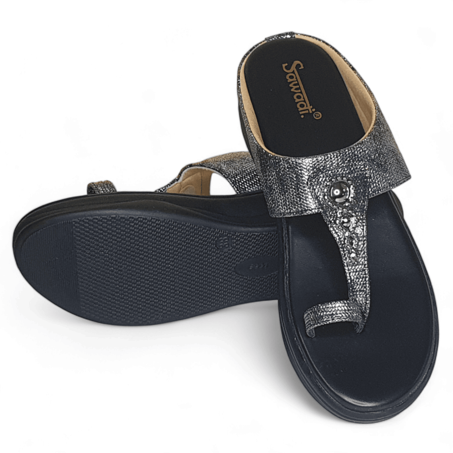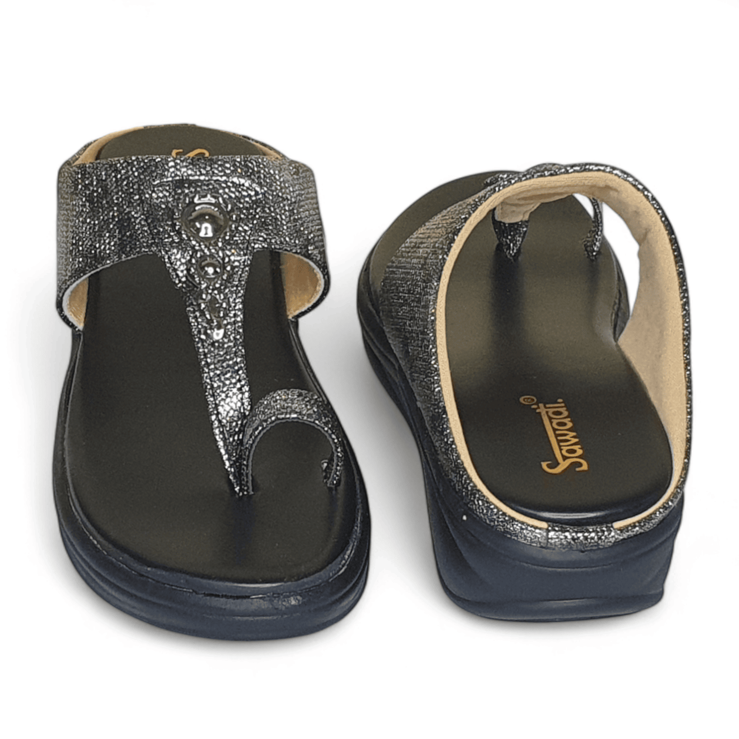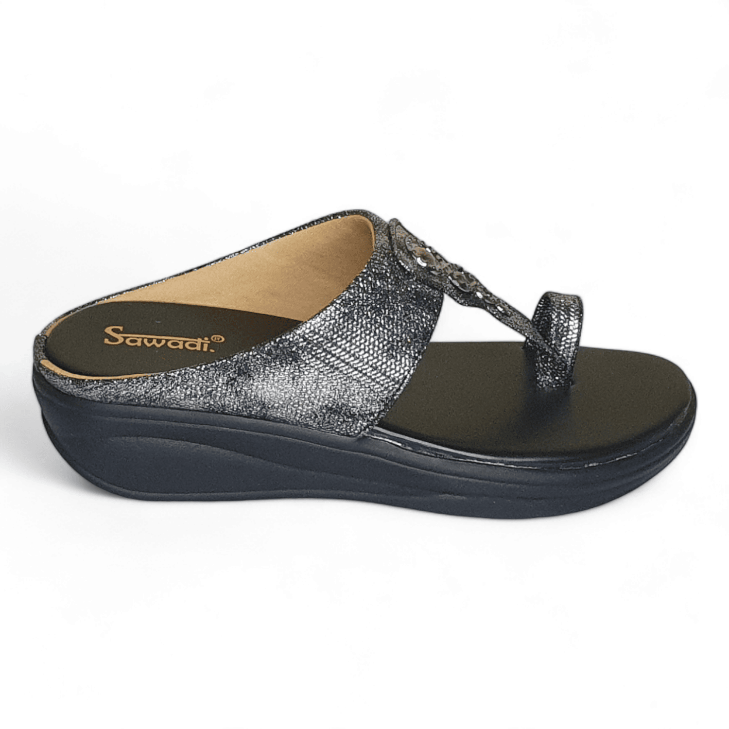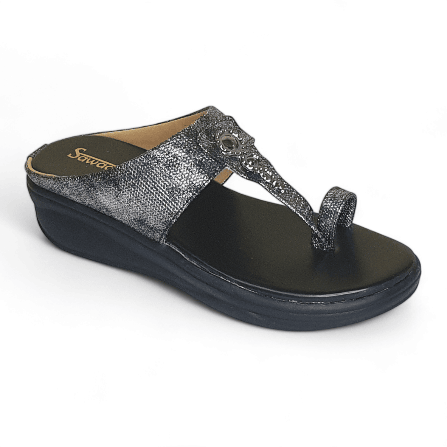 Home / Products / Sawadi Women’s Black Shimmer Wedge Sandals | Stylish Toe-Ring Slip-On for Daily & Party Wear Price inclusive of all tax