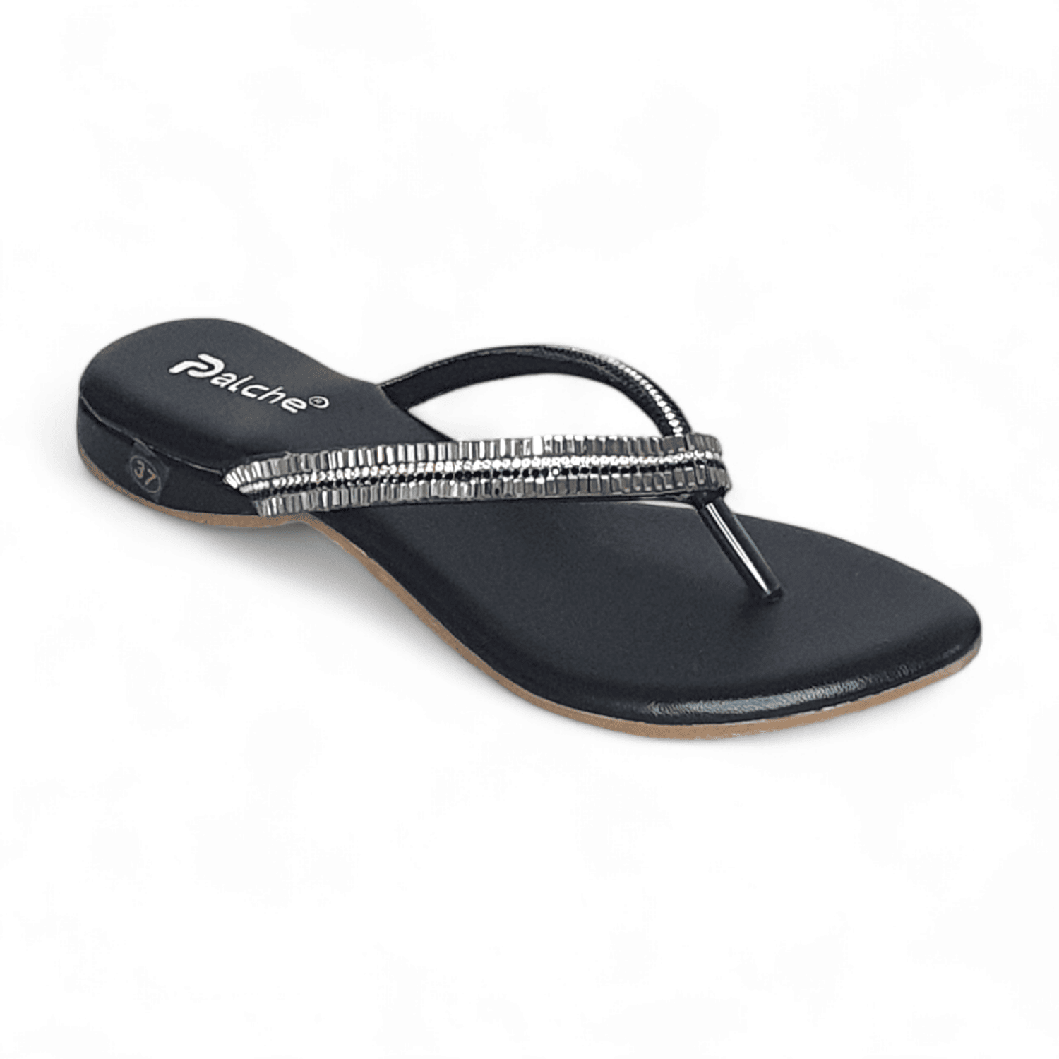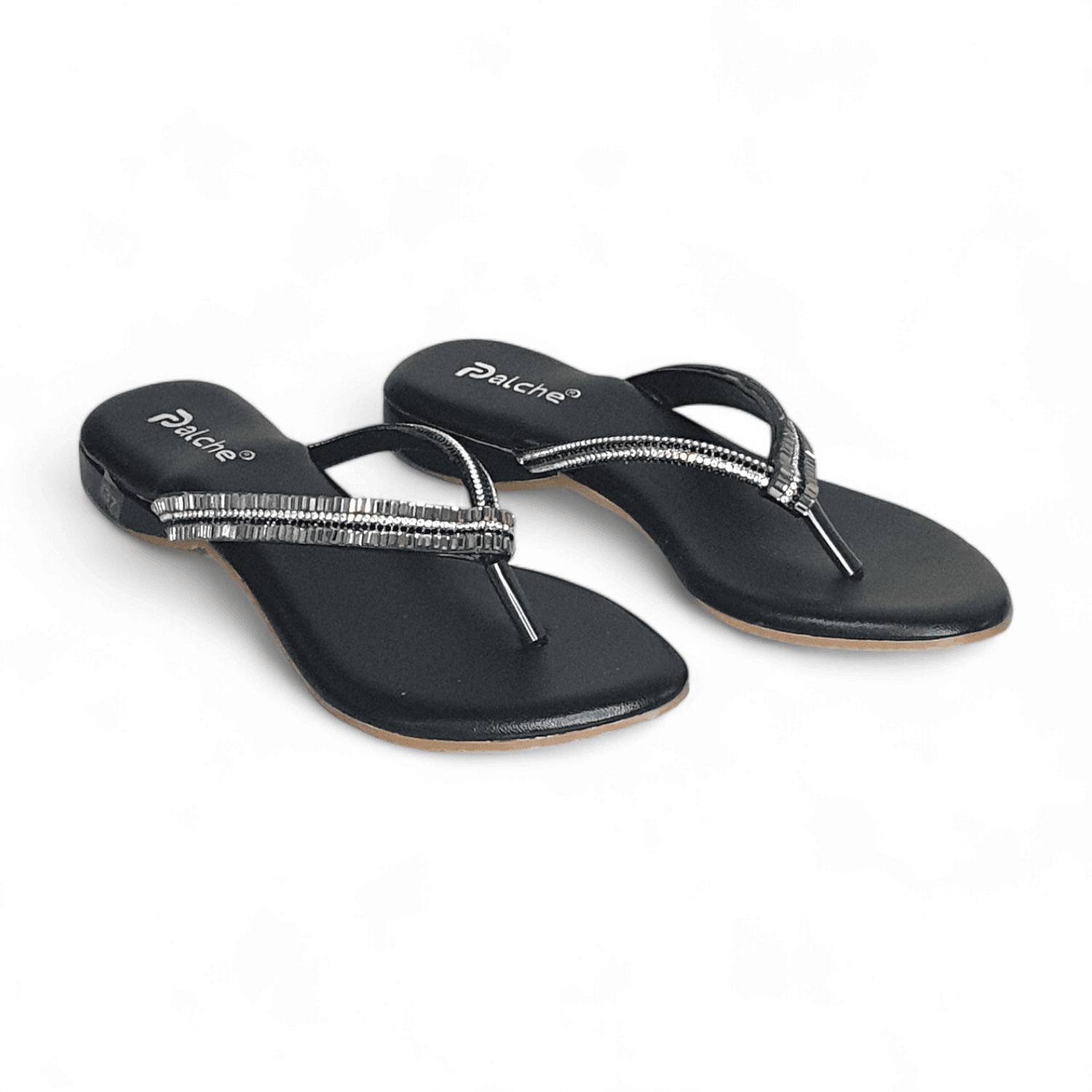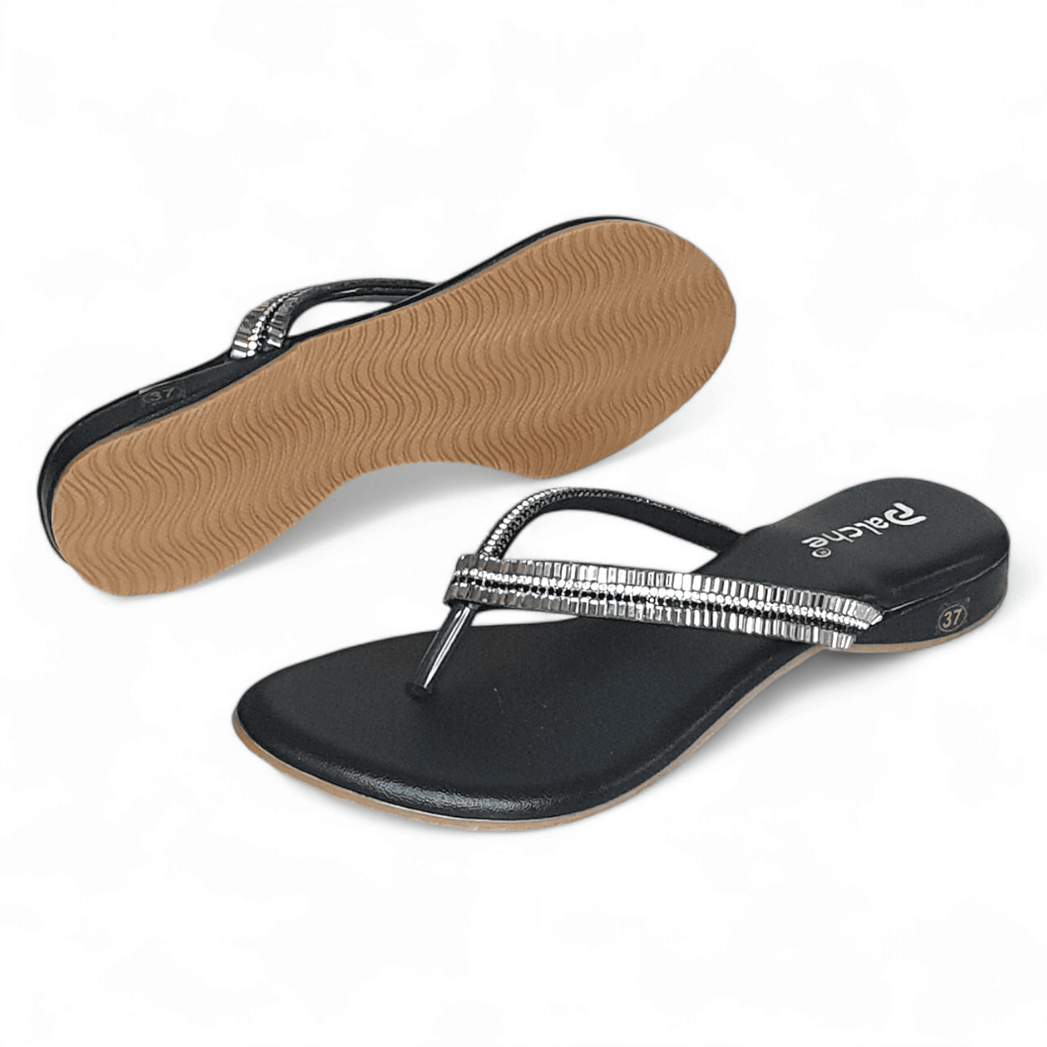 Discover glamorous black flat thong slippers with dazzling silver embellishments at SawadiMart. Perfect for adding a touch of elegance to any occasion. Shop online across India.